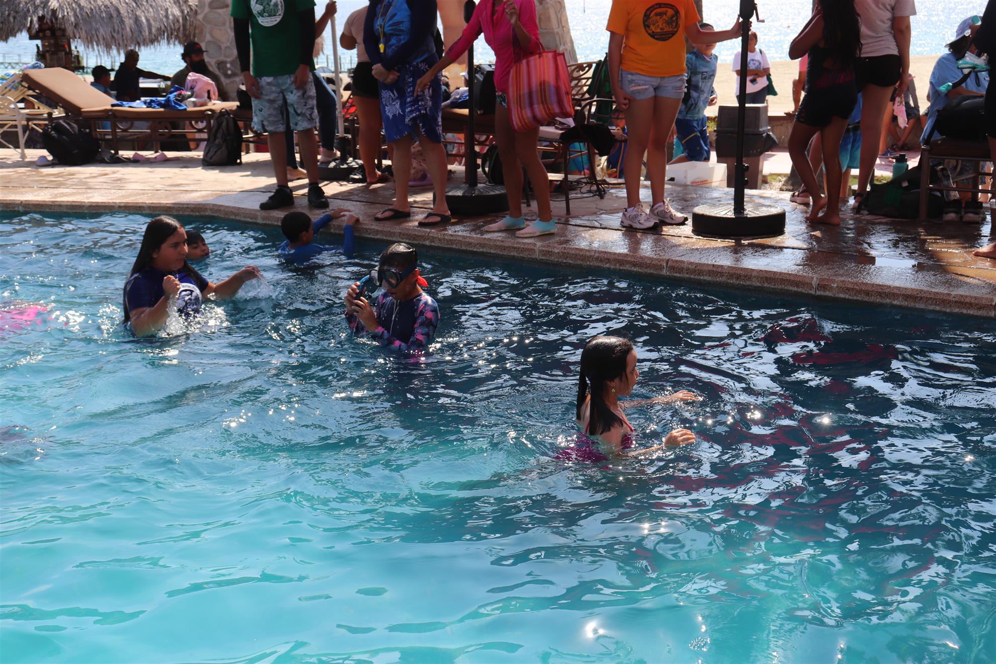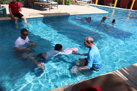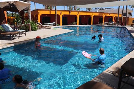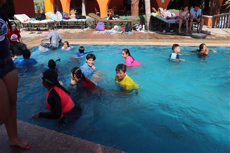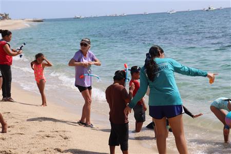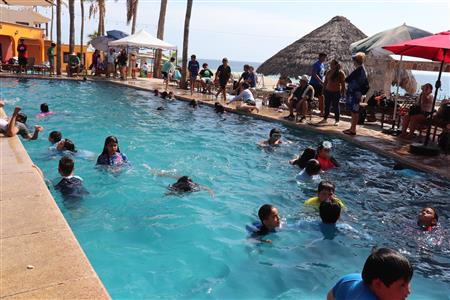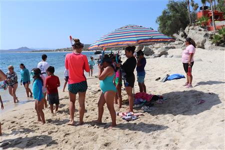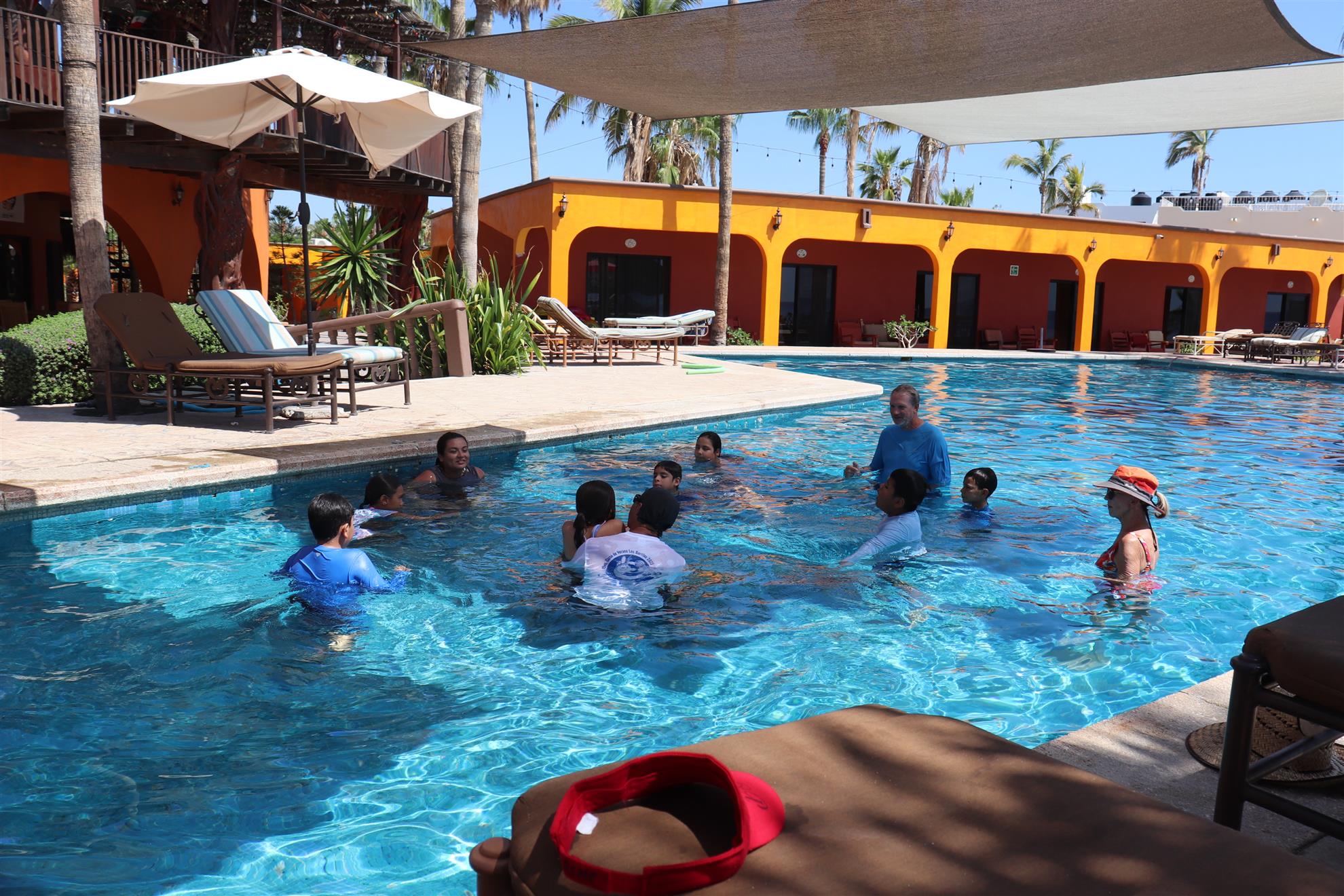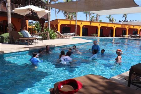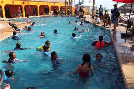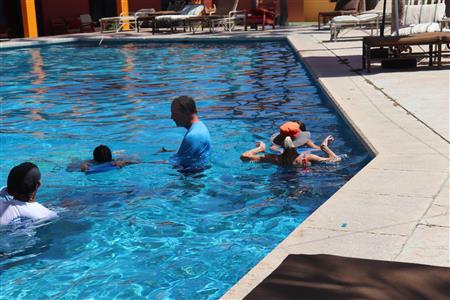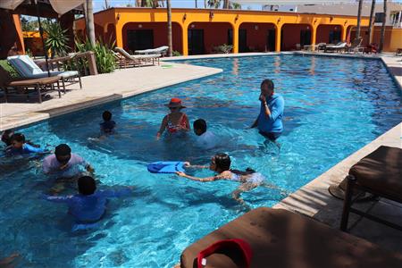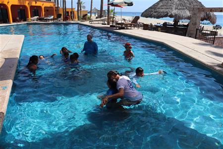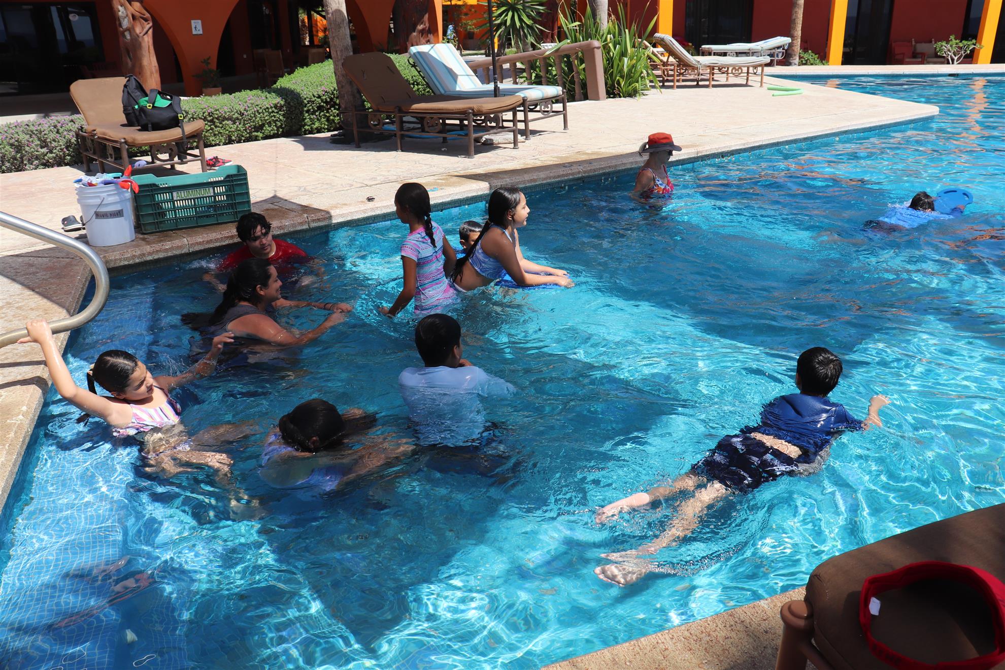 Los Barriles Club Rotarians volunteer to instruct swimming to children. Teaching children to swim improves safety, health and provides positive attitude for children.