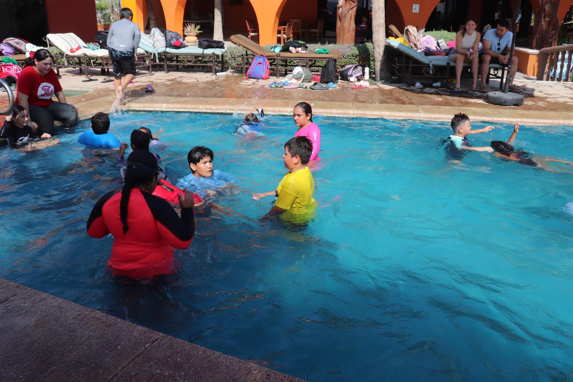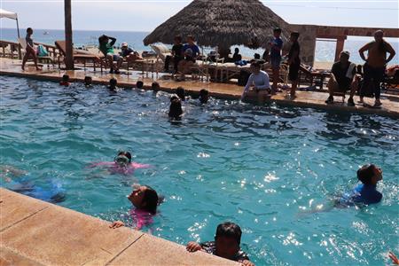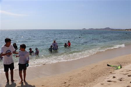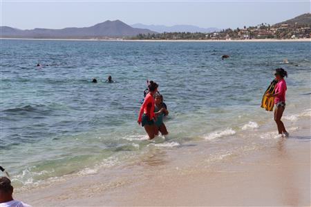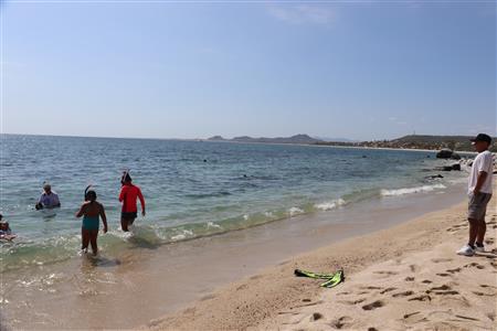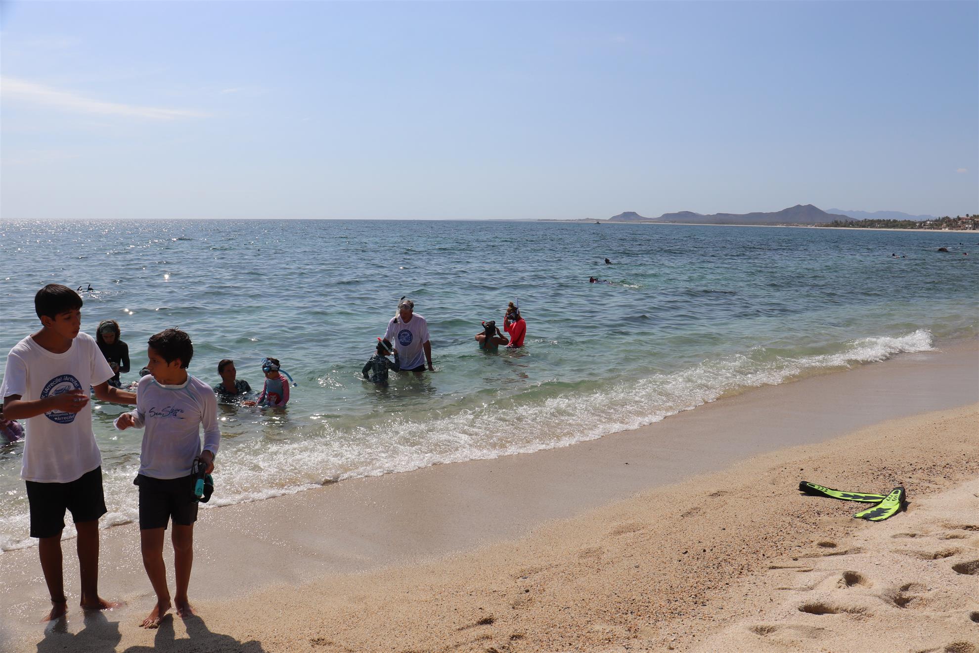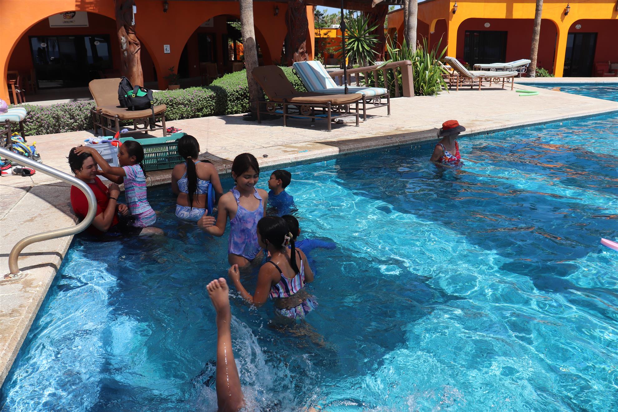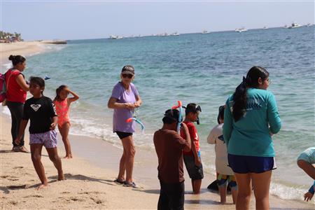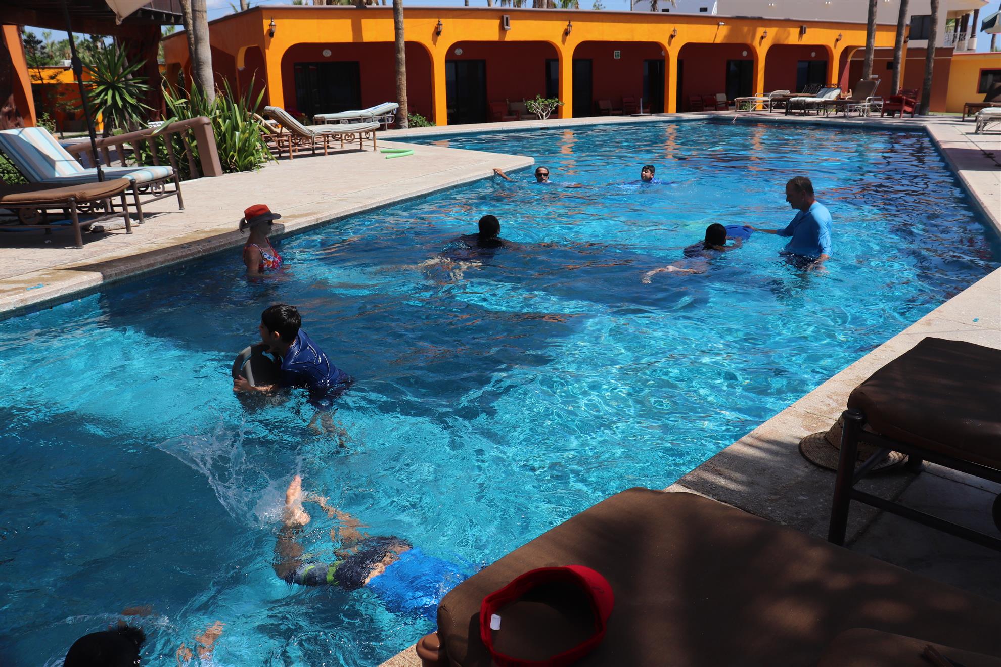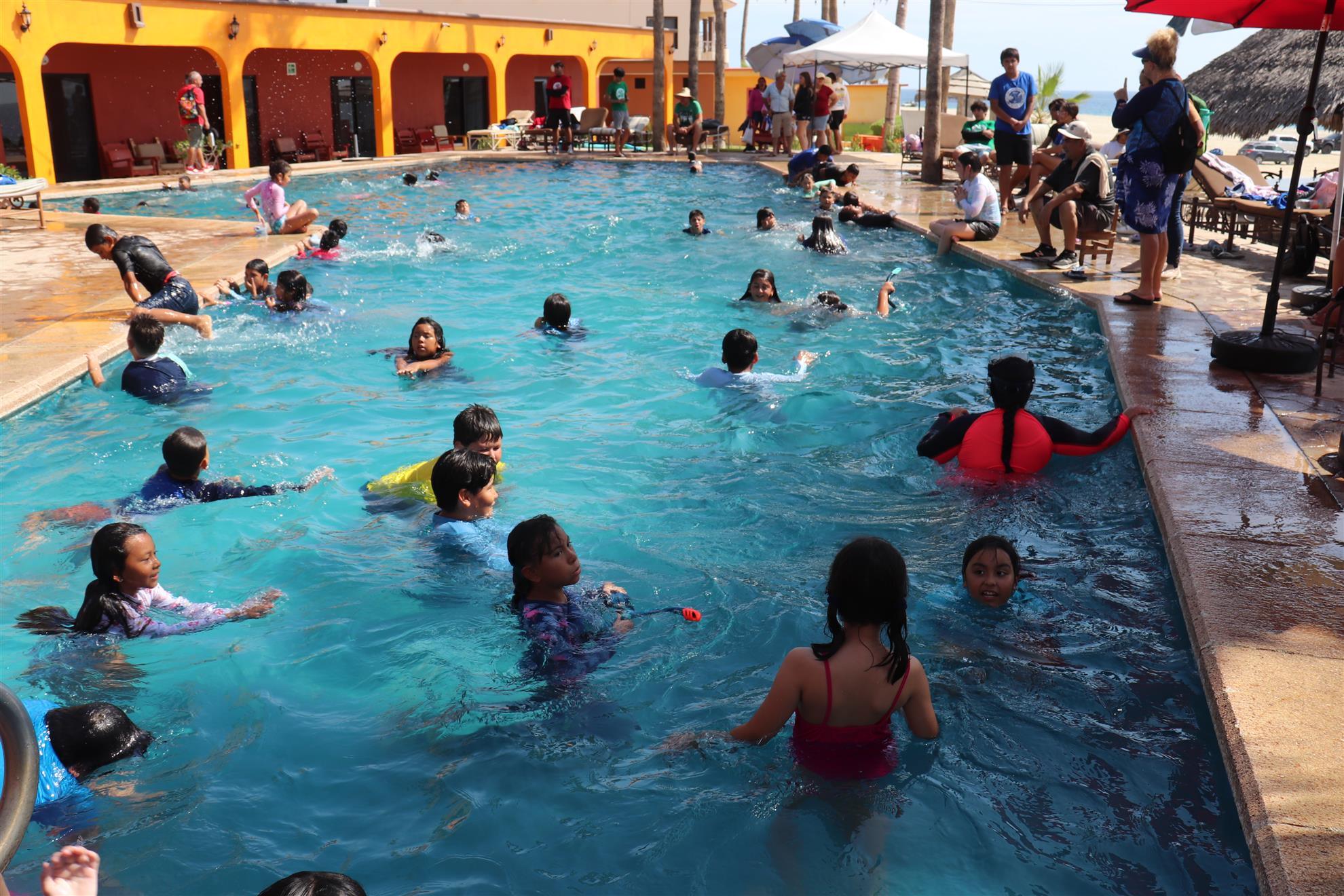 Los Barriles Club Rotarians volunteer to instruct swimming to children. Teaching children to swim improves safety, health and provides positive attitude for children.